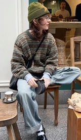 The Eclectic Grandpa aesthetic is characterized by a mix of classic menswear pieces with retro streetwear influences. Cozy, colorful knitwear is often paired with quilted jackets or corduroy outerwear. Shearling accessories add a touch of luxury, and mixing and matching patterns and textures is one of the defining features of the style.
