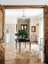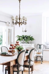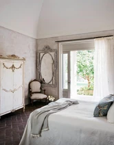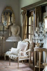 French Provincial interior design is characterized by a harmonious blend of elegance and rustic simplicity. Walls are often painted in muted tones, such as cream, beige, or pale grey, providing a neutral backdrop for furnishings and decorative elements. Flooring typically consists of wood or stone, with rugs adding warmth and texture. Natural light is maximized through the use of large windows, often with shutters or drapes made from linen or cotton. Fireplaces, with their rustic mantels, serve as focal points in living spaces. Decorative elements include mirrors, artwork featuring landscapes or still lifes, and ceramics. Fresh flowers and potted plants bring a touch of nature indoors.
