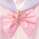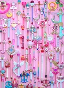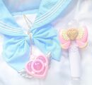 Magical girl-inspired fashion, also known as Mahou Kei, shares many visual similarities with Fairy Kei. Beyond the casual outfits with magical girl print, there are also many frilly sailor uniforms and over-the-top Lolita dresses inspired by the outfits from the various series. Handmade transformation compact brooches and magic wands are popular accessories. Different to other styles, wigs are very common to be worn due to the extensive styling that gives a more otherworldly feeling to the outfit.