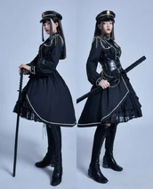 The centerpiece of a Military Lolita coordinate is often a structured, tailored jacket or coat. These jackets are typically double-breasted and adorned with gold buttons, decorative braids, and epaulettes on the shoulders. Blouses often feature high collars and military-style details. These tops are paired with the standard Lolita bell-shaped or A-line skirt, which is often pleated to add to the sense of formal structure.[1] The color palette is dominated by dark, formal colors such as black, navy blue, deep green, khaki, and burgundy.