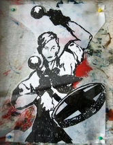 One of Laibachkunst's central images is "Red Thrower" (1981), which features industrial motifs like factories, cogs, wheels, and a worker with a hammer. The inclusion of reproduced images of the Mona Lisa in the painting represents the reproducibility of images in the context of industrialization and mechanical reproduction. The color red represents the political context of communism and Yugoslavia's "Existing Socialism."