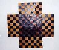 Another notable piece is "Kreuzschach" (1971-1981), a functional chessboard for four players.[2] Similar to Duchamp's readymades, Kreuzschach turns an everyday object into a piece of art by placing it within an institutional setting. It also references Kazimir Malevich's Suprematist painting "The Black Cross," though they never explicitly acknowledged it.