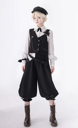 The pants are the single most distinguishing component of an Boystyle oordinate, immediately separating the style from the skirts and petticoats of Lolita fashion. For Ouji, the primary pieces are shorts or knickerbockers, sometimes referred to as pumpkin pants, which are typically gathered at the knee. When long trousers are worn in Dandy, they appear in various styles, ranging from high-waisted to punk-influenced designs, sometimes featuring connected half-skirts for added complexity.