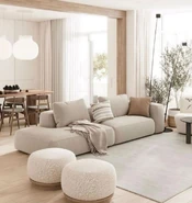 Furniture typically features simple and functional designs, with clean lines and minimal ornamentation. Pieces are often made of wood, with upholstery in natural fabrics like linen or wool. Comfort is also valued, with designs that focus on ergonomics and support. Decorative elements are minimal and carefully selected, emphasizing functionality and natural materials. Plants, ceramics, and textiles with simple patterns are common additions, bringing personality and warmth to the space.