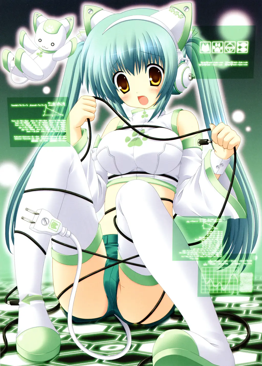 The release of Hatsune Miku in 2007 by Crypton Future Media also solidified the TechnoNeko2000 look. As a "permanently 16-year-old" piece of software, Miku's design (featuring arm-warmers resembling synthesizer displays and signature teal pigtails) became the template for the era's futurist character design.[2] Fanart from this era (roughly 2007–2012) frequently placed Miku in "digital voids" filled with speakers and floating screens, which has been retrospectively categorized as part of the Frutiger Aero design trend of the time.