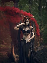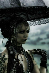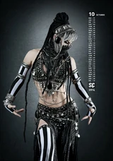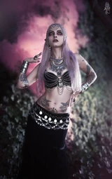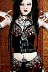 The color palette is predominantly black, often accented with deep reds, purples, or dark earth tones. Traditional belly dance materials are supplemented or replaced with Goth staples like lace, leather, and velvet. The style heavily incorporates elements of what is sometimes called a "modern primitive" look.[3] This includes a strong emphasis on natural and handmade accessories, such as jewelry made from bone, wood, and stone. An abundance of piercings, large tribal-style tattoos, and hairstyles like dreadlocks or long, messy hair are also key features of the aesthetic.[2]