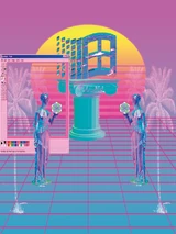 Due to some similar aesthetic cues, most notably neon grids, palm trees, and sunsets, it can be easy to confuse the aesthetics of Synthwave and Vaporwave. However, they are two separate aesthetics with different goals. Vaporwave is more political and satirical, using consumerist media and presenting its nostalgia in a dreamy or trippy way with faded pastel colors and glitched visuals. It often incorporates Japanese visuals, reflecting Japan's economic and technological boom during the era it references.