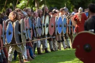 While in battle vikings use round shields, and for weapons they use spears, a sword or battle axe, or bows.